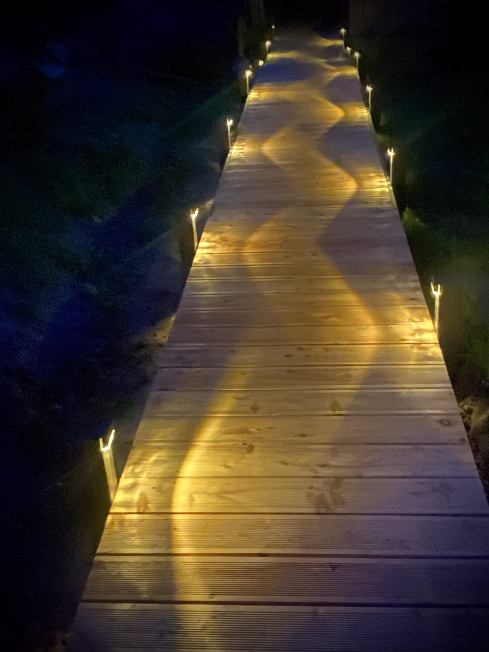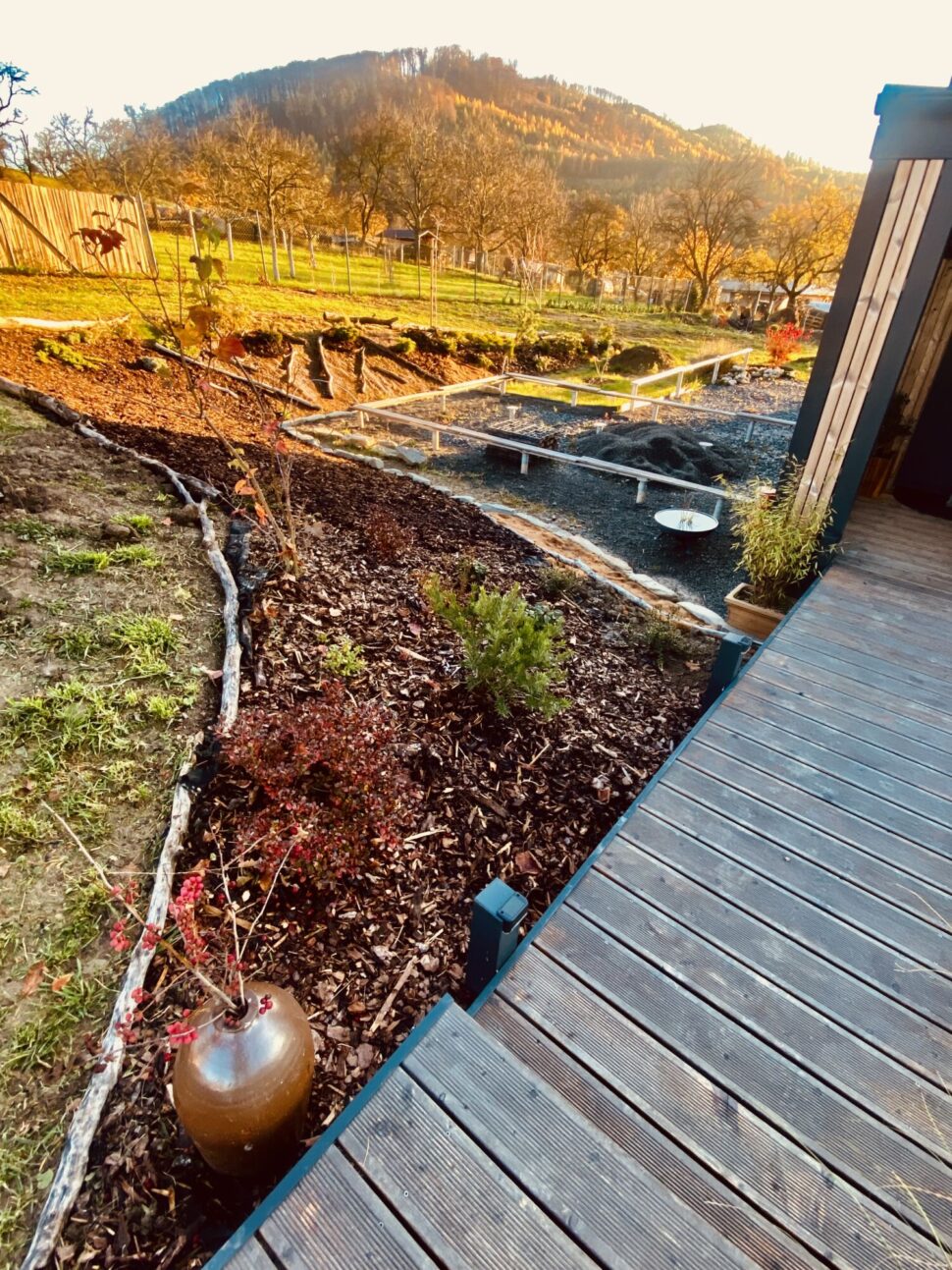 Chodníky jsou dřevěné a taktéž na vrutech, připomínající ty z šumavských vřesovišť. Povedou také v jižní části zahrady od terasy k biotopu s protékající vodou. Biotop LASKAVO se stane na Hostsfeře místem, zasvěceným živlu Vody. Už se pomalu naváží kameny, připravuje hráz s kaskádou a následovat bude pochůzné dřevěné molo s ponornou částí v jezírku . Zahradu jsem vloni oplotila a nově osázela stromy, keři a léčivými bylinami a teď už ji mají v rukou přírodní živly a tok času.