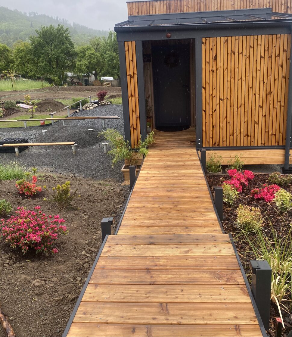 Postup jak takový projekt vzniká, uvidíte ve fotogalerii pod textem. Už jsem si užila prostorově velkých domů a chtěla si postavit bydlení bez hypotéky, vyhnout se tunám betonu, opěrným zdem a dlážděným chodníkům. Druhý modul, který bude sloužit jako atelier a prostor pro hosty, se k realizaci teprve chystá. Krytá terasa dvacet pět metrů čtverečních pak vytvoří příjemně zastíněný prostor pro život venku.